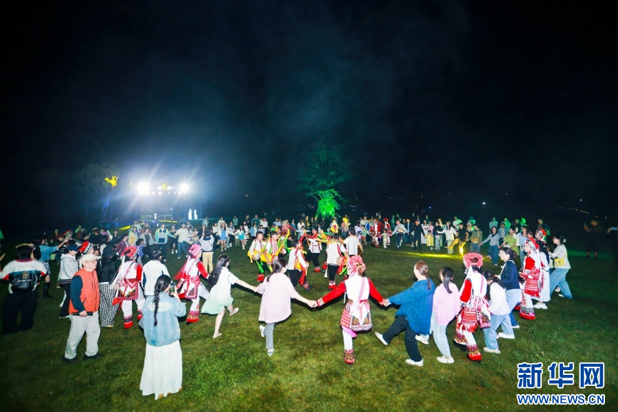 游客在太平湖国际生态旅游度假区体验民族风情(资料图)。新华网发(弥勒市委宣传部 供图)