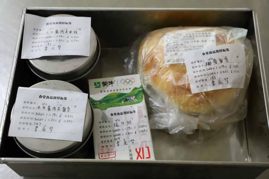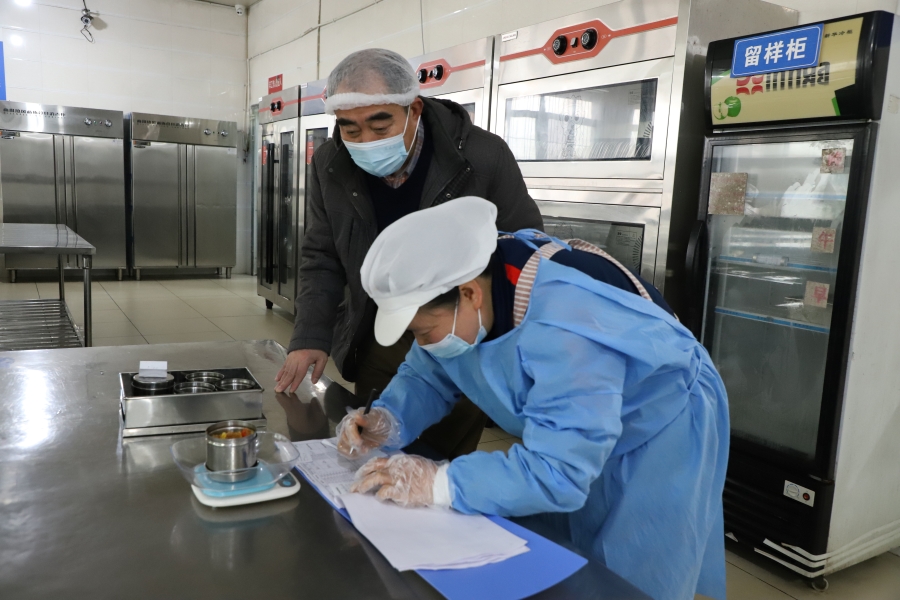 食堂工作人员对午餐进行留样采集(1月19日摄)。