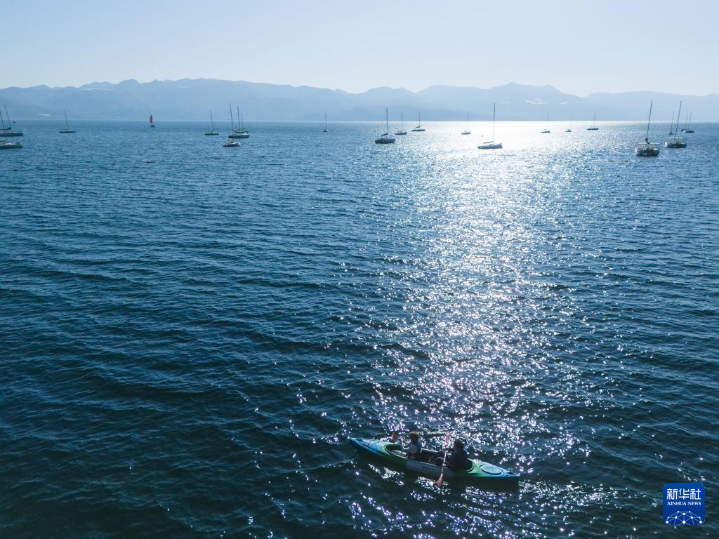 1月27日,游客在云南省玉溪市抚仙湖划船游玩(无人机照片)。新华社记者 高咏薇 摄