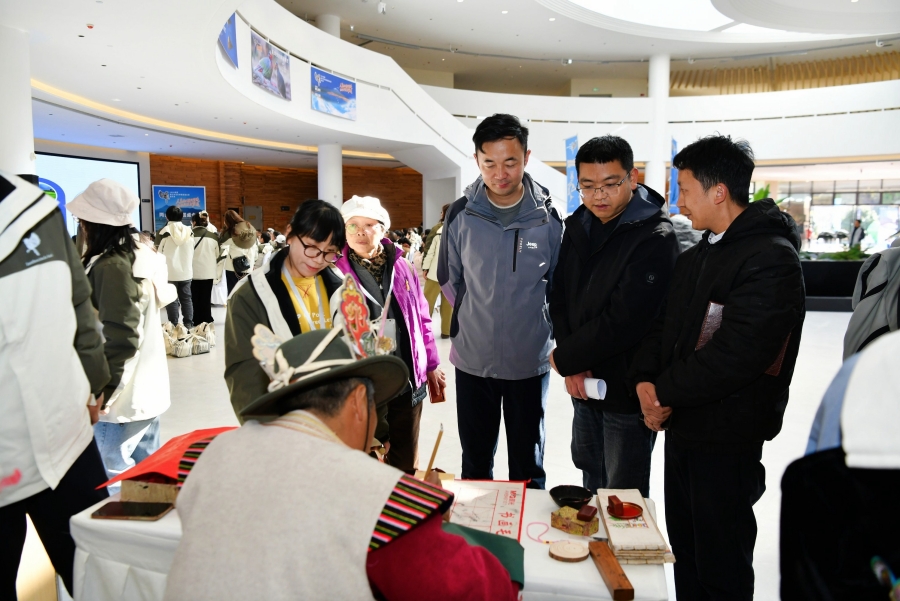 与会嘉宾体验东巴文书写(2月2日摄)。