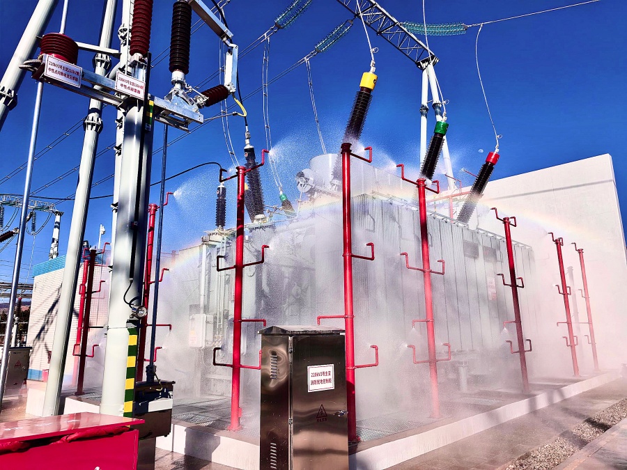 昆明供电局正在对220千伏樟木箐变电站新建主变开展喷淋试验(1月29日摄)。付家海 摄