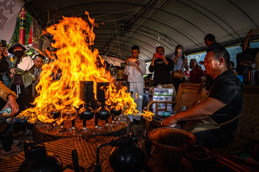 “咖”叔正在制作“火烧咖啡”(2月1日摄)。
