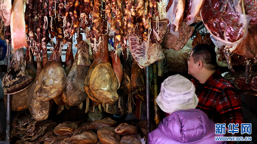 来自省外的游客正在挑选云南腊味产品(2月5日摄)。新华网发(徐华陵 摄)