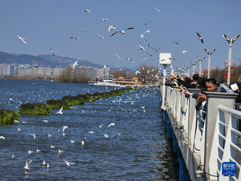 除夕当天,许多游客和市民来到云南省昆明市海埂大坝,观赏越冬的红嘴鸥。