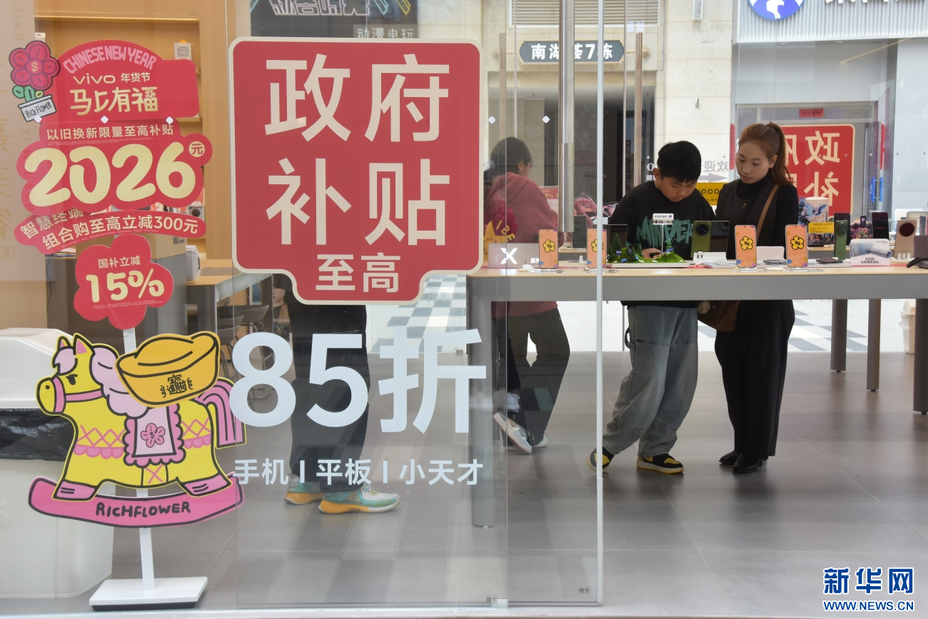 消费者在云南蒙自一手机店选购电子数码产品(2月23日摄)。新华网发(薛莹莹 摄)