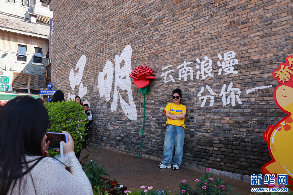 游客在昆明老街网红打卡墙拍照打卡(2月18日摄)。新华网发(郑益 摄)