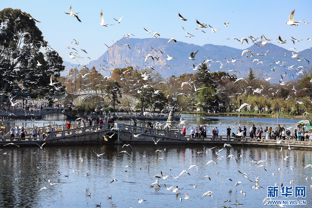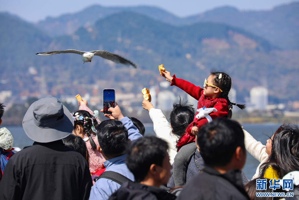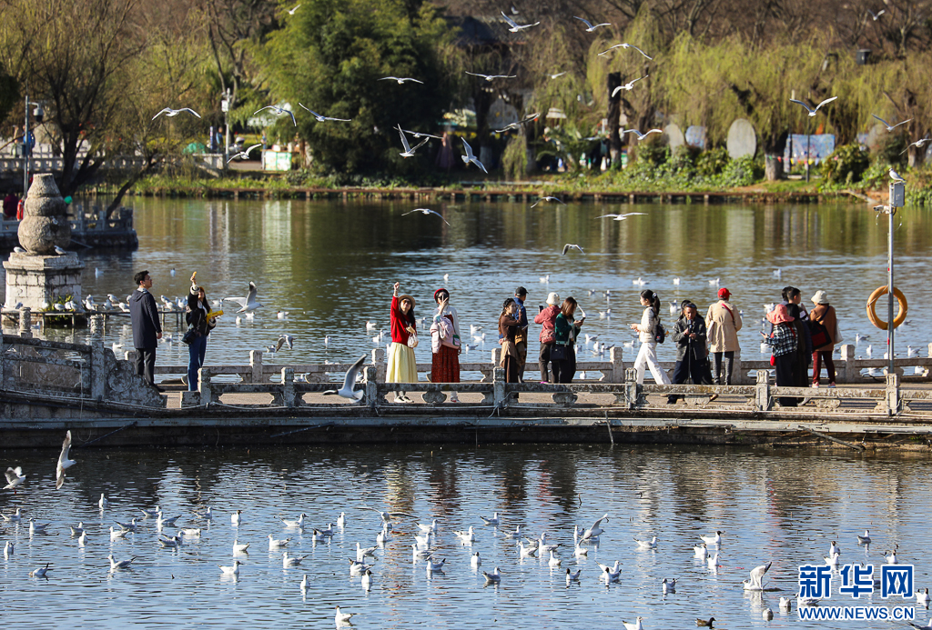 游客在昆明大观公园观赏红嘴鸥(2月21日摄)。新华网发(郑益 摄)