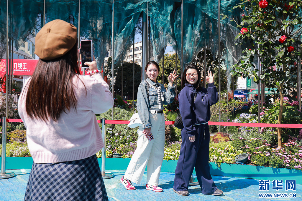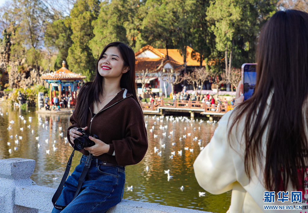 游客在昆明大观公园拍照打卡(2月21日摄)。新华网发(郑益 摄)
