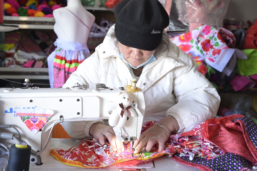 熊金菊赶制苗族服饰(1月23日摄)。张成志 摄