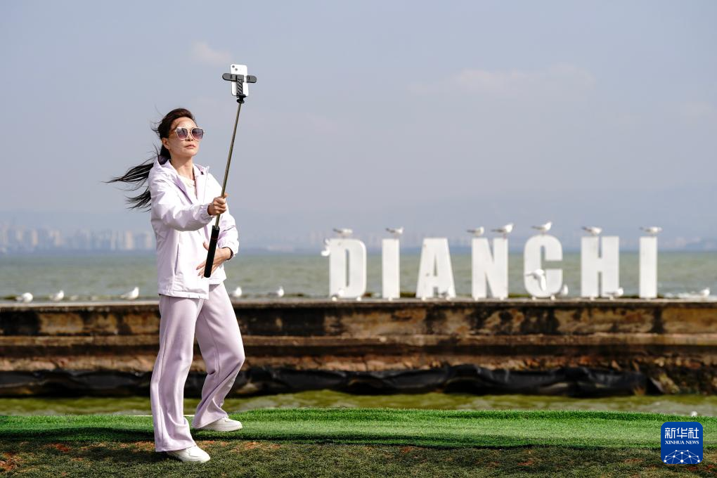 2月26日,游客在滇池边自拍留念。新华社记者 陈欣波 摄