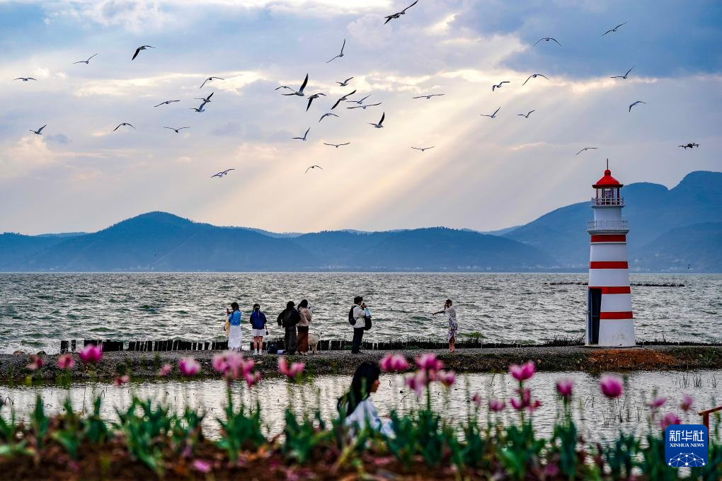 春日暖阳下,昆明滇池碧波荡漾,远山如黛,红嘴鸥翩跹起舞。游人沿岸漫步、驻足拍摄,共绘出一幅生动宜人的春游画卷。