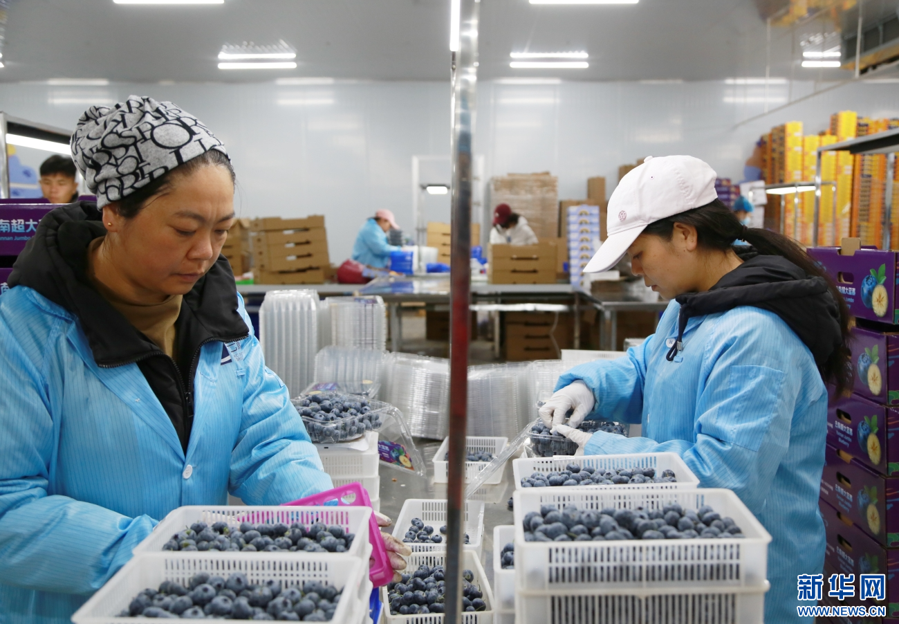 3月1日,工人在云南省蒙自市的云科创现代农业科技有限公司加工厂中心车间分拣、包装蓝莓。新华网发(薛莹莹 摄)