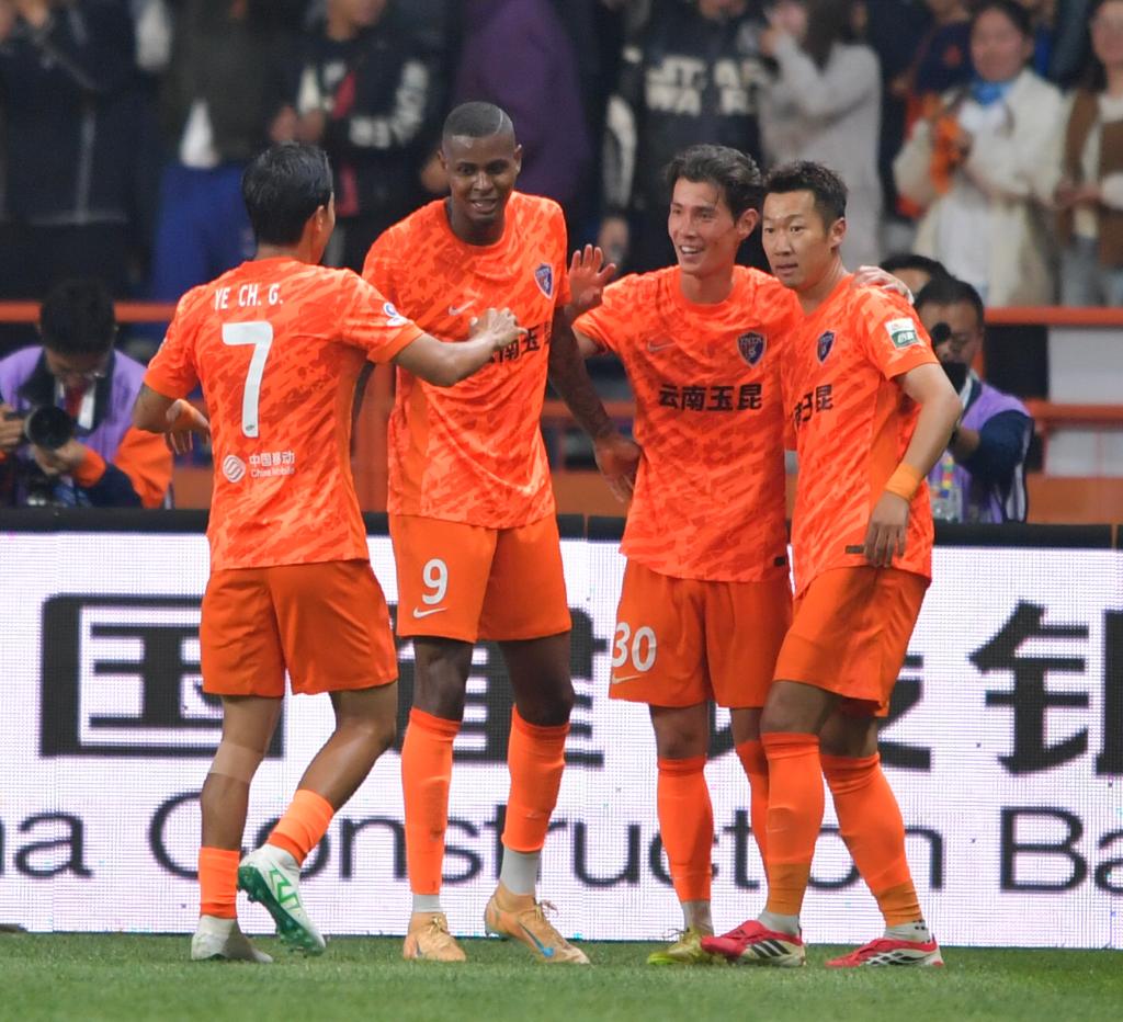 3月7日,云南玉昆队球员弋腾(右二)在比赛中庆祝进球。 新华社记者 陈欣波 摄