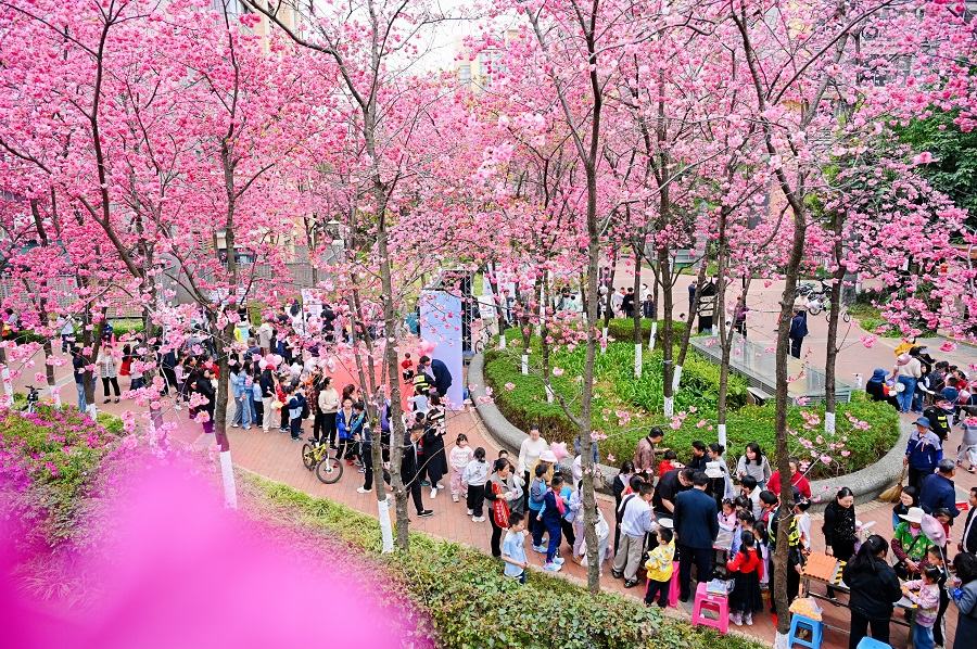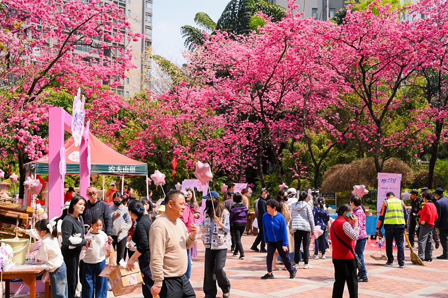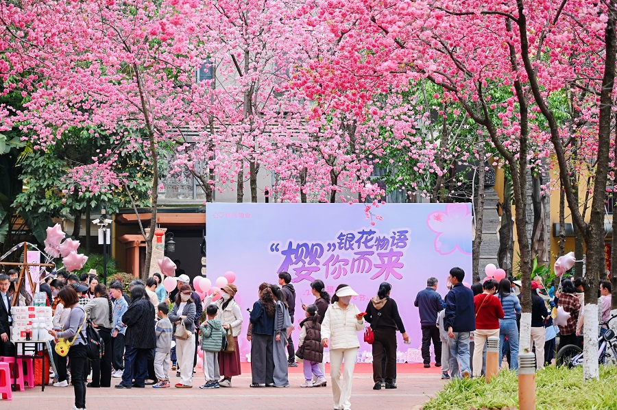 3月8日,2026银海樱花节在昆明银海樱花语、荷塘月色、金江小区同步启幕。本届樱花节以“银花物语·‘樱’你而来”为主题,将春日盛景与社区温情深度融合,为居民打造了一场春日赏樱盛宴。