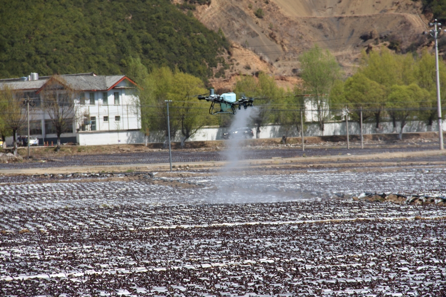 高原特色冷凉蔬菜种植基地里无人机正在喷洒农药(3月20日摄)。