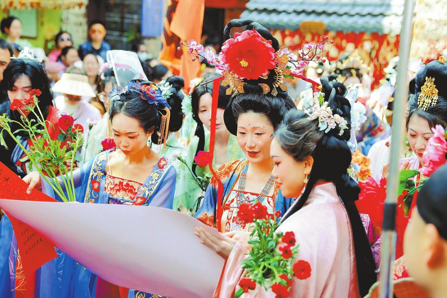 近日,昆明市金殿名胜区迎来第十届花朝节,现场举办了祭花神、汉服巡游、古风展演、民俗体验等活动,众多游客换上传统服饰,踏青探春、游园赏花,享受春日时光。图为游客参与传统春分庆祝仪式。(记者 高吴双 摄)