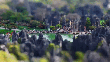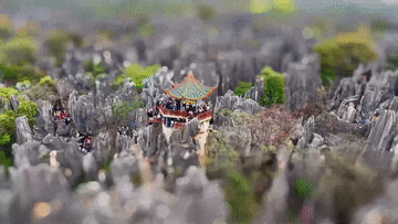 春日,移轴镜头下的石林萌趣如卡通动画,景区门口用鲜花搭建了骏马、当地民族特色服饰“撒尼花包头”等造型的艺术装置吸引游客拍照打卡。