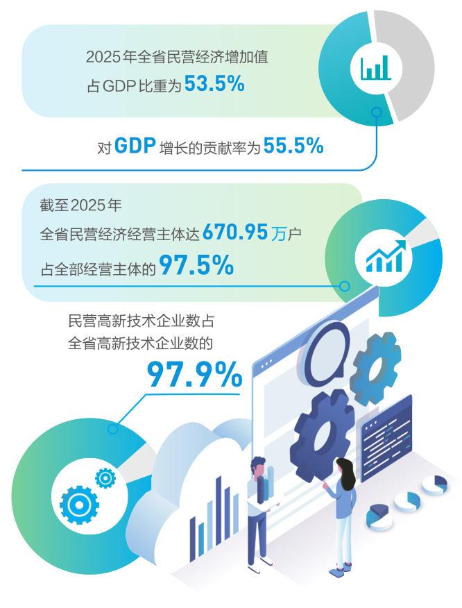 2025年全省民营经济增加值占GDP比重为53.5%,较2024年的53.3%提高0.2个百分点,增长4.4%,高于GDP增速0.3个百分点,对GDP增长的贡献率为55.5%,撑起全省经济发展的“半壁江山”。