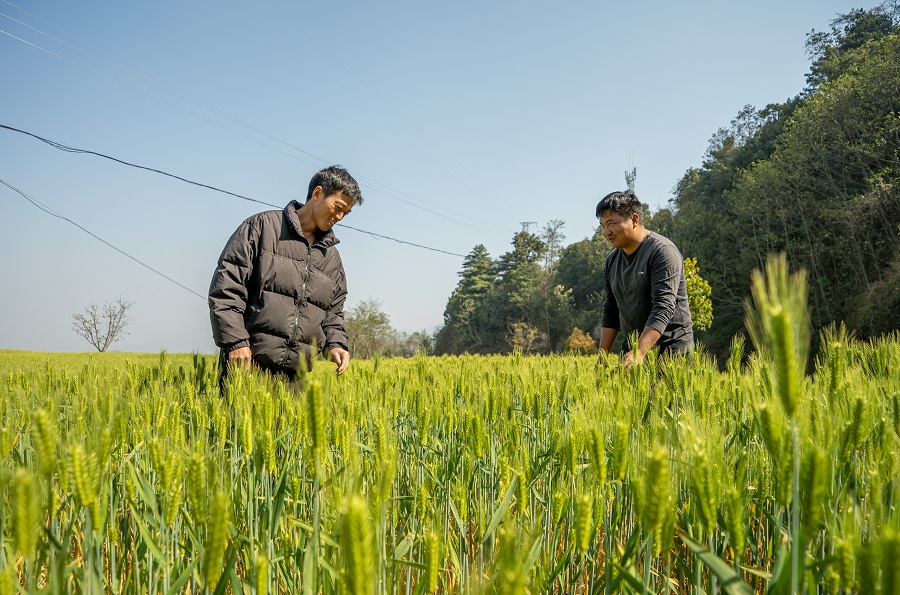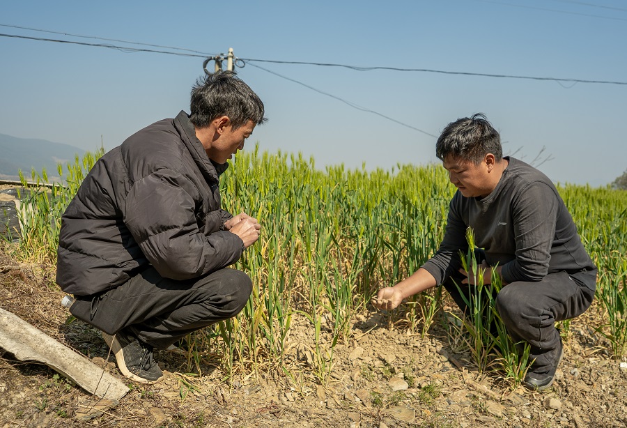 谢子龙与杨荣清正在观察麦子长势(3月11日摄)。