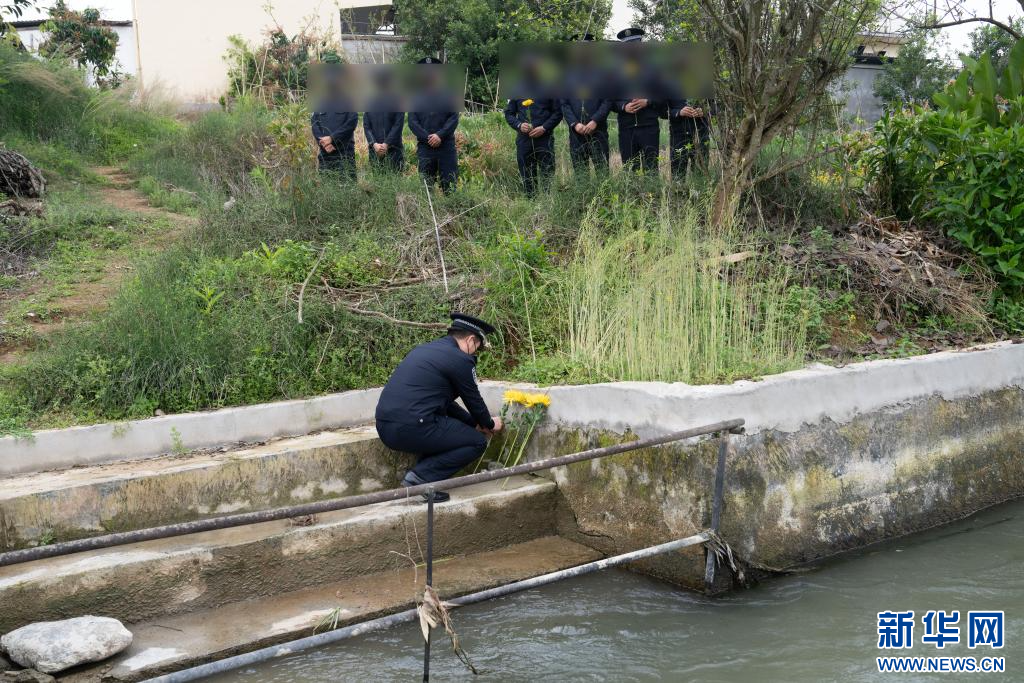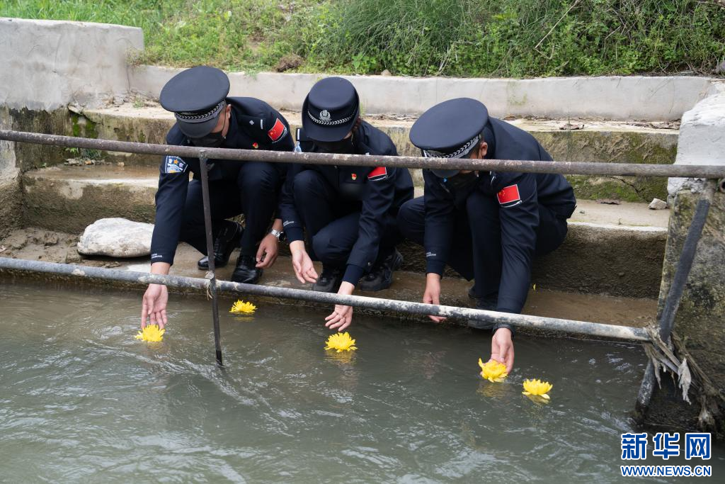 陈锡华生前的战友在他牺牲的水渠旁投放象征思念的黄菊。