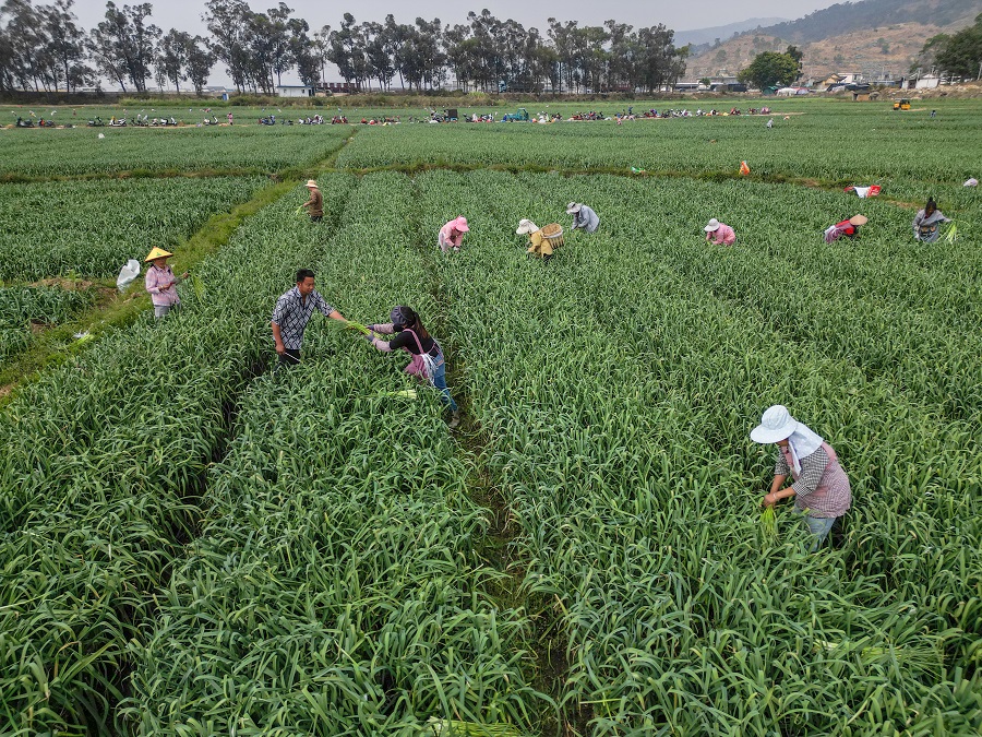 烟农正在采收蒜苔(3月12日摄)。