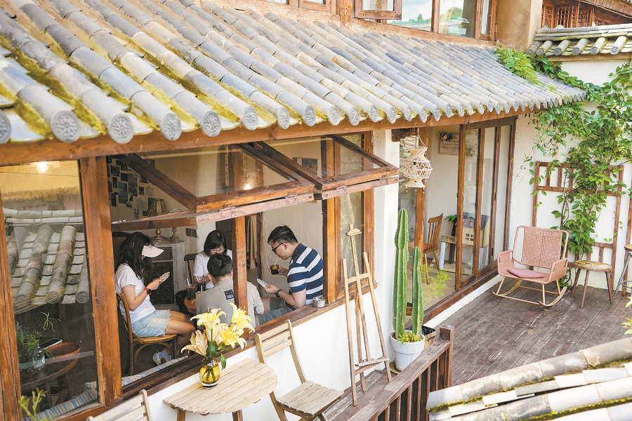 游客在乐居村一家咖啡店内打牌休闲。 新华社