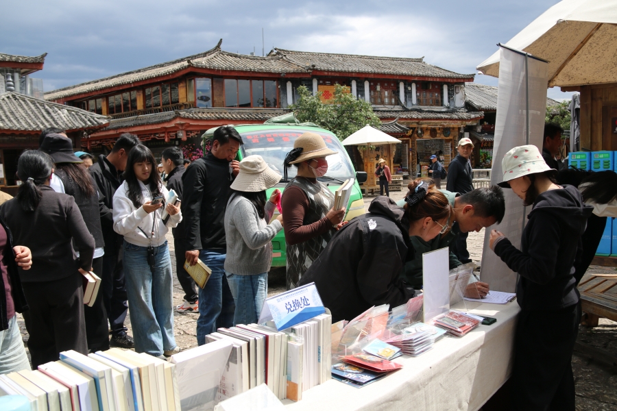 活动当天上午,本土知名作家、学者蔡晓龄开展“谈读书”主题讲座,围绕阅读与滇西北人文脉络、纳西文化守护的关联这一主题,深入浅出分享阅读感悟与创作心得,现场互动氛围热烈,游客与市民踊跃提问,在交流中深化对本土文化的理解。讲座结束后,旧书换文创公益活动上线,市民和游客纷纷捐赠闲置旧书,兑换特色文创产品,让闲置书籍焕发新活力,传递环保与分享的理念。