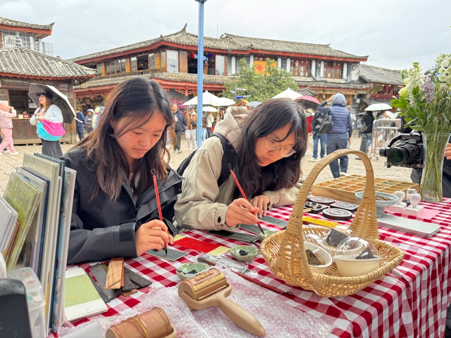下午,纳西古乐展示活动举行,宣科书房古乐团现场演奏经典曲目,工作人员细致解读纳西古乐的历史渊源与艺术价值,让现场观众在悠扬古韵中感受中华音乐“活化石”的魅力。随后,东巴文书签书写、人生箴言抽卡、手作串珠等沉浸式体验活动轮番开展。书香与咖啡香交织,欢声笑语充盈四方街。
